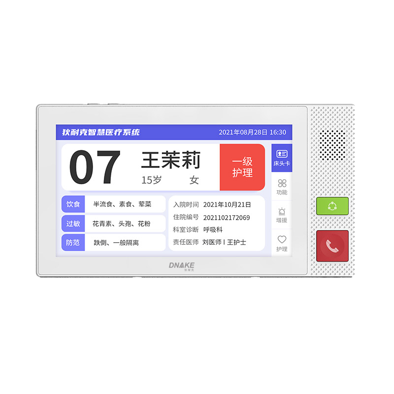 安裝在病床頭的交互設(shè)備機(jī),代替?zhèn)鹘y(tǒng)紙質(zhì)卡。產(chǎn)品支持呼叫對講、為住院患者提供病例查詢、狀態(tài)自動提醒等護(hù)理需求等。
