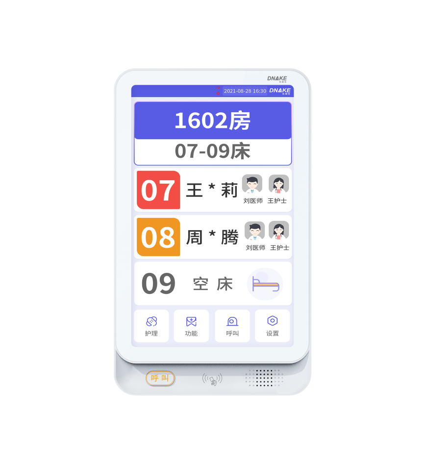 設(shè)置在病房門口的終端設(shè)備,主要用于顯示病房相關(guān)信息,內(nèi)置簡易醫(yī)護(hù)工作站,支持病房床位一覽、患者動(dòng)態(tài)跟蹤、呼叫對(duì)講、增援求救等多種呼叫類型,信息齊全,及時(shí)響應(yīng)醫(yī)護(hù)需求,實(shí)現(xiàn)智能化醫(yī)護(hù)管理。