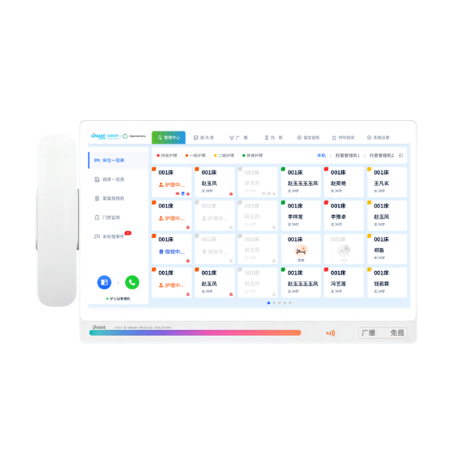 設(shè)置在護(hù)士站,可壁掛也可直接放在桌面上。主要接聽病區(qū)內(nèi)病床分機(jī)的呼叫以及患者信息查詢、廣播等基礎(chǔ)應(yīng)用功能,減輕醫(yī)護(hù)人員來回跑動(dòng)的無效勞動(dòng)和壓力,及時(shí)響應(yīng)患者需求,并做好醫(yī)護(hù)信息管理。軟件參數(shù):1)采用多點(diǎn)觸控電容顯示屏操作。每個(gè)觸摸按鈕可以顯示整個(gè)病區(qū)下的,所有病人的名字、性別、護(hù)理等級(jí),點(diǎn)擊格子后,可顯示每張病床患者更具體的患者信息。2)基于TCP/IP網(wǎng)