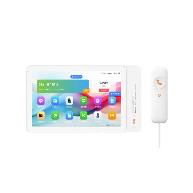 安裝在病床頭的交互設(shè)備機(jī),代替?zhèn)鹘y(tǒng)紙質(zhì)卡。產(chǎn)品支持呼叫對講、為住院患者提供病例查詢、狀態(tài)自動(dòng)提醒等護(hù)理需求等。