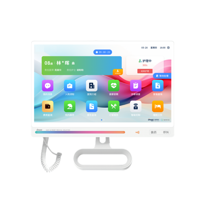 1)采用多點觸控電容觸摸屏,超薄面板,含手持呼叫手柄,安裝在病床上方的多功能擺臂上,每個病床一臺,用于呼叫護士站,患者基本信息展示。