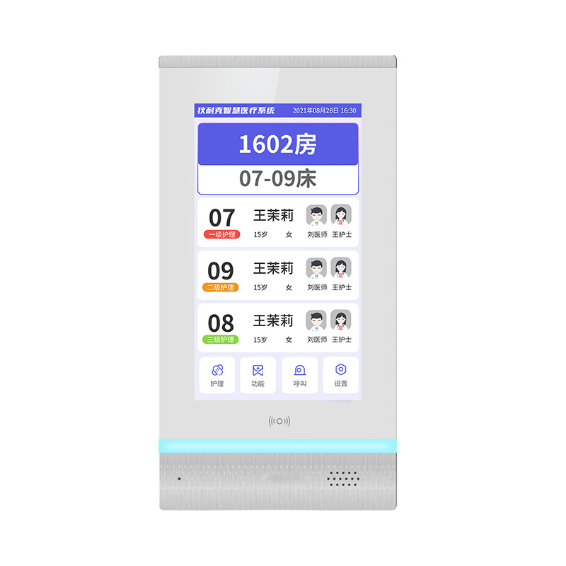 設(shè)置在病房門口的終端設(shè)備,主要用于顯示病房相關(guān)信息,內(nèi)置簡易醫(yī)護(hù)工作站,支持病房床位一覽、患者動態(tài)跟蹤、呼叫對講、增援求救等多種呼叫類型,信息齊全,及時響應(yīng)醫(yī)護(hù)需求,實現(xiàn)智能化醫(yī)護(hù)管理。