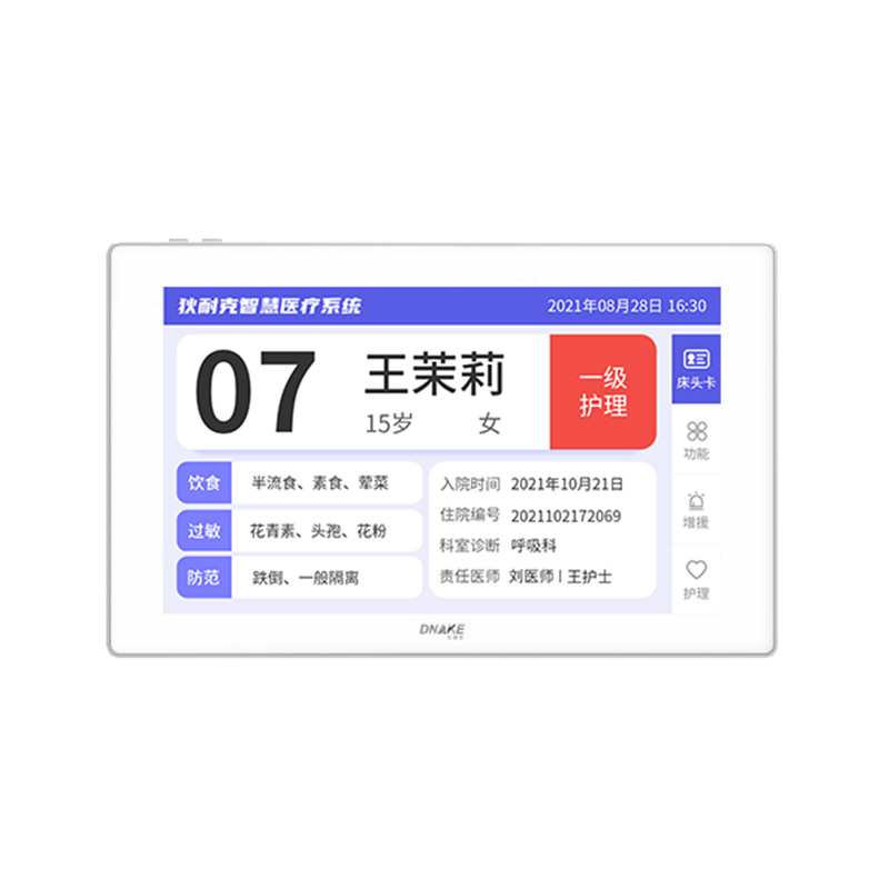 安裝在病床頭的交互設(shè)備機(jī),代替?zhèn)鹘y(tǒng)紙質(zhì)卡。產(chǎn)品支持呼叫對(duì)講、為住院患者提供病例查詢(xún)、狀態(tài)自動(dòng)提醒等護(hù)理需求等。