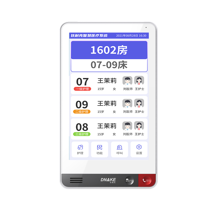 設(shè)置在病房門口的終端設(shè)備,主要用于顯示病房相關(guān)信息,內(nèi)置簡(jiǎn)易醫(yī)護(hù)工作站,支持病房床位一覽、患者動(dòng)態(tài)跟蹤、呼叫對(duì)講、增援求救等多種呼叫類型,信息齊全,及時(shí)響應(yīng)醫(yī)護(hù)需求,實(shí)現(xiàn)智能化醫(yī)護(hù)管理。