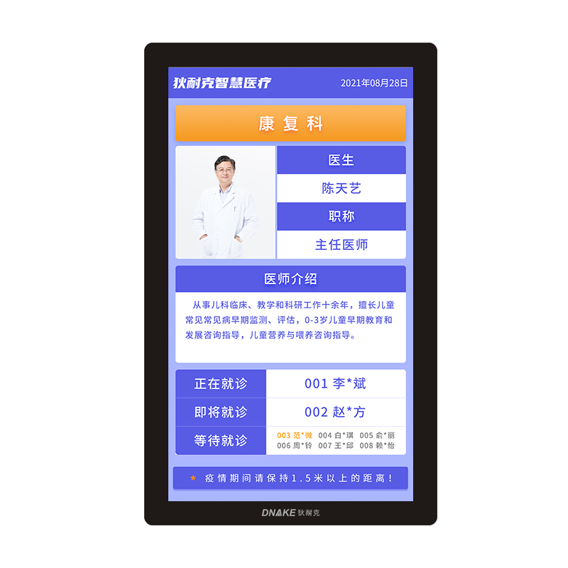 每個(gè)診室部署一臺(tái)液晶顯示終端,顯示出診專(zhuān)家(出診專(zhuān)科、健康宣教等)信息,診室叫號(hào)時(shí)全屏(或分屏)顯示需就診患者信息。